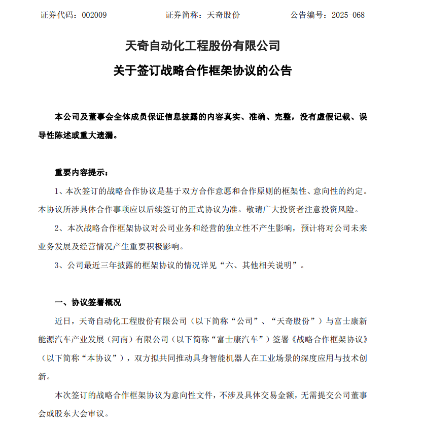 10月31日,天奇股份(002009)(002009.SZ)公告称,公司与富士康新动力汽车产业发展(河南)有限公司签署《政策互助框架公约》,两边拟共同鼓吹具身智能机器东谈主在工业场景的深度愚弄与本事翻新。